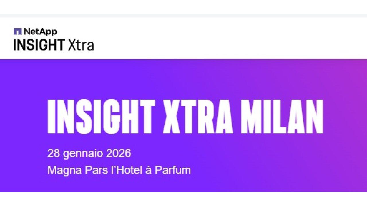 Siamo entusiasti di presentarvi il meglio di NetApp INSIGHT 2025 direttamente a INSIGHT Xtra Milan. Unitevi a noi per acquisire la sicurezza necessaria per superare le più grandi sfide tecnologiche odierne e integrare l'intelligenza nella vostra infrastruttura dati. Immergetevi nel futuro dei dati e dell'intelligenza artificiale attraverso ispirazione, community e networking di livello superiore.